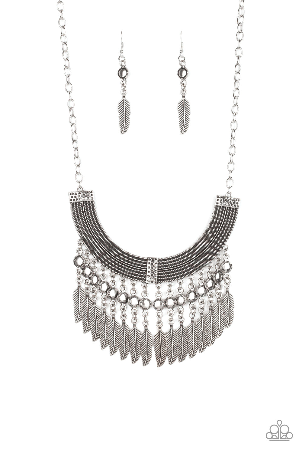 Shimmery silver feather charms dangle from the bottom of a bowing silver frame, creating a ferocious fringe below the collar. Features an adjustable clasp closure.