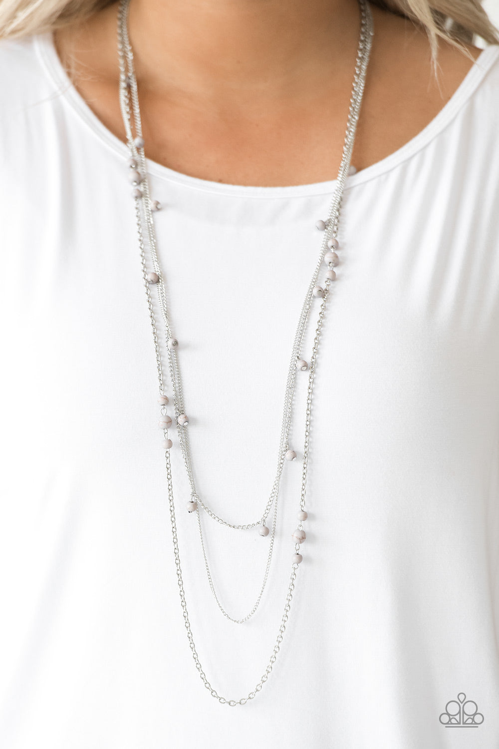 Infused with a plain silver chain, mismatched gray stone beads sporadically trickle along shimmery silver chains, creating earthy layers down the chest. Features an adjustable clasp closure.