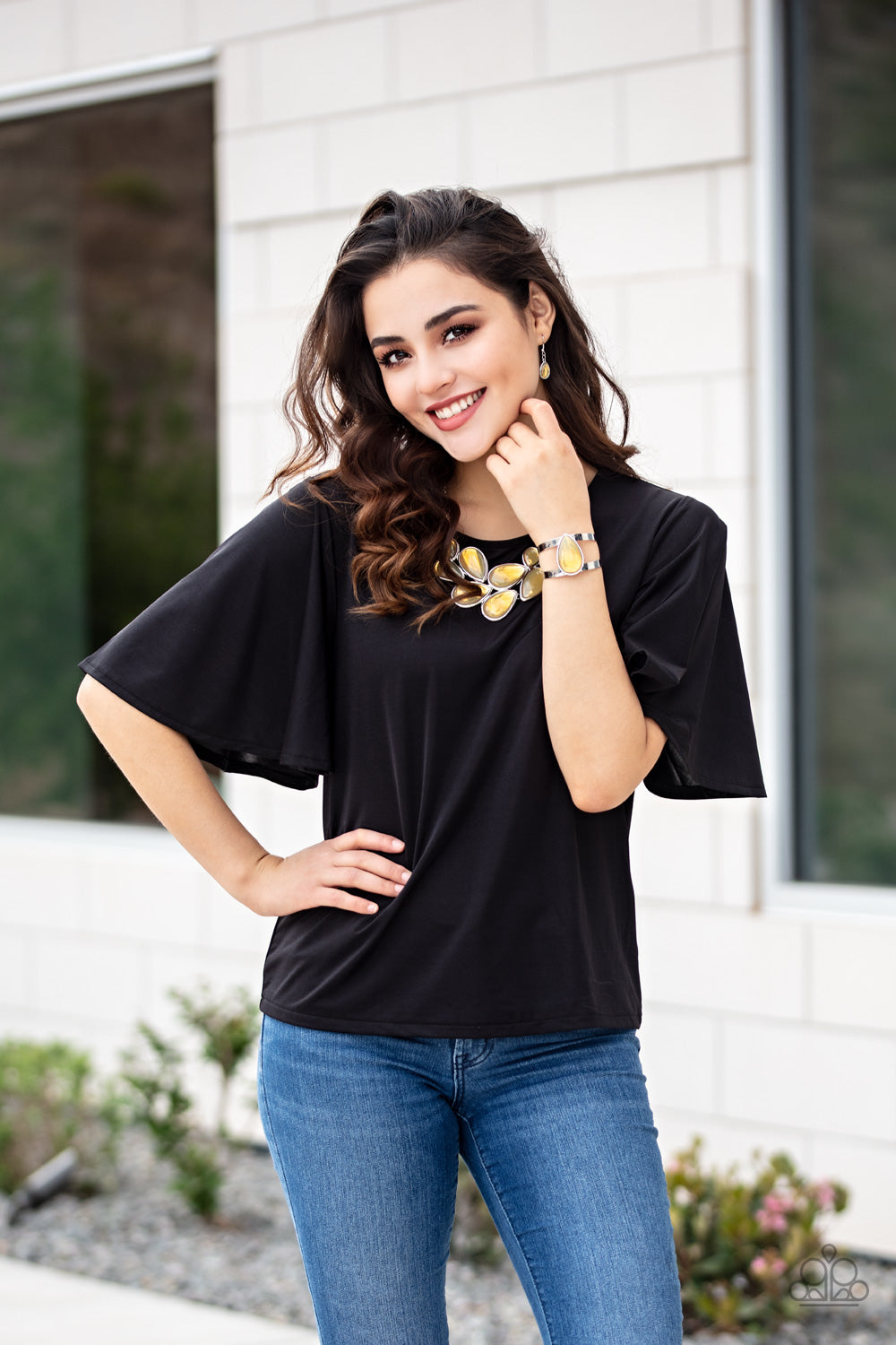 Sleek silver frames encase opalescent yellow teardrops that cluster together to create a bubbly statement piece. Features an adjustable clasp closure.