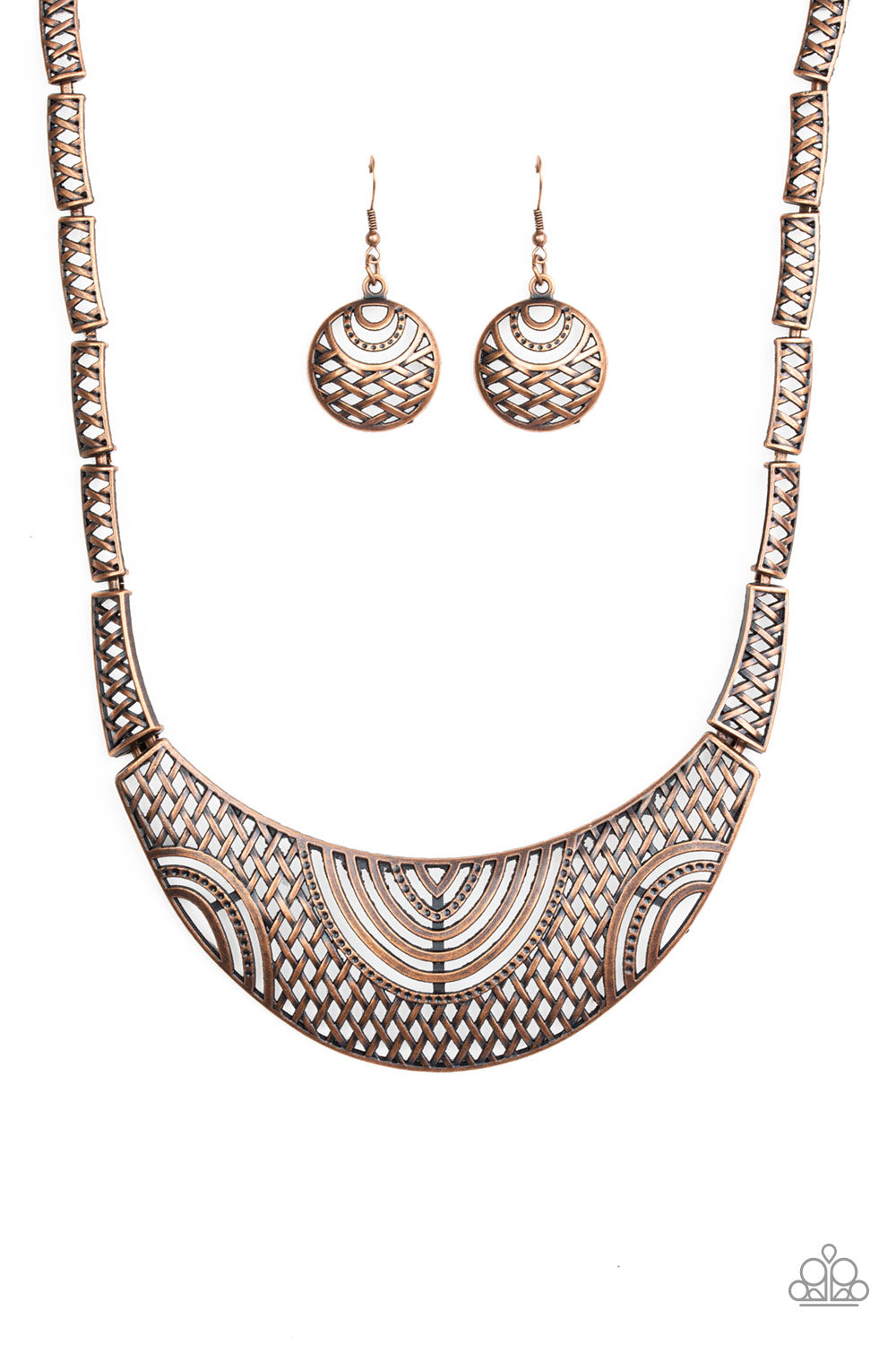 Featuring crisscrossed detail, dainty copper frames link below the collar, giving way to a dramatic half-moon plate radiating with airy tribal details for a fierce look. Features an adjustable clasp closure.