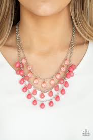 Featuring sparkling faceted finishes, layers of glassy, opaque, and polished coral teardrop beads cascade below the collar for a whimsical ombre effect. Features an adjustable clasp closure.